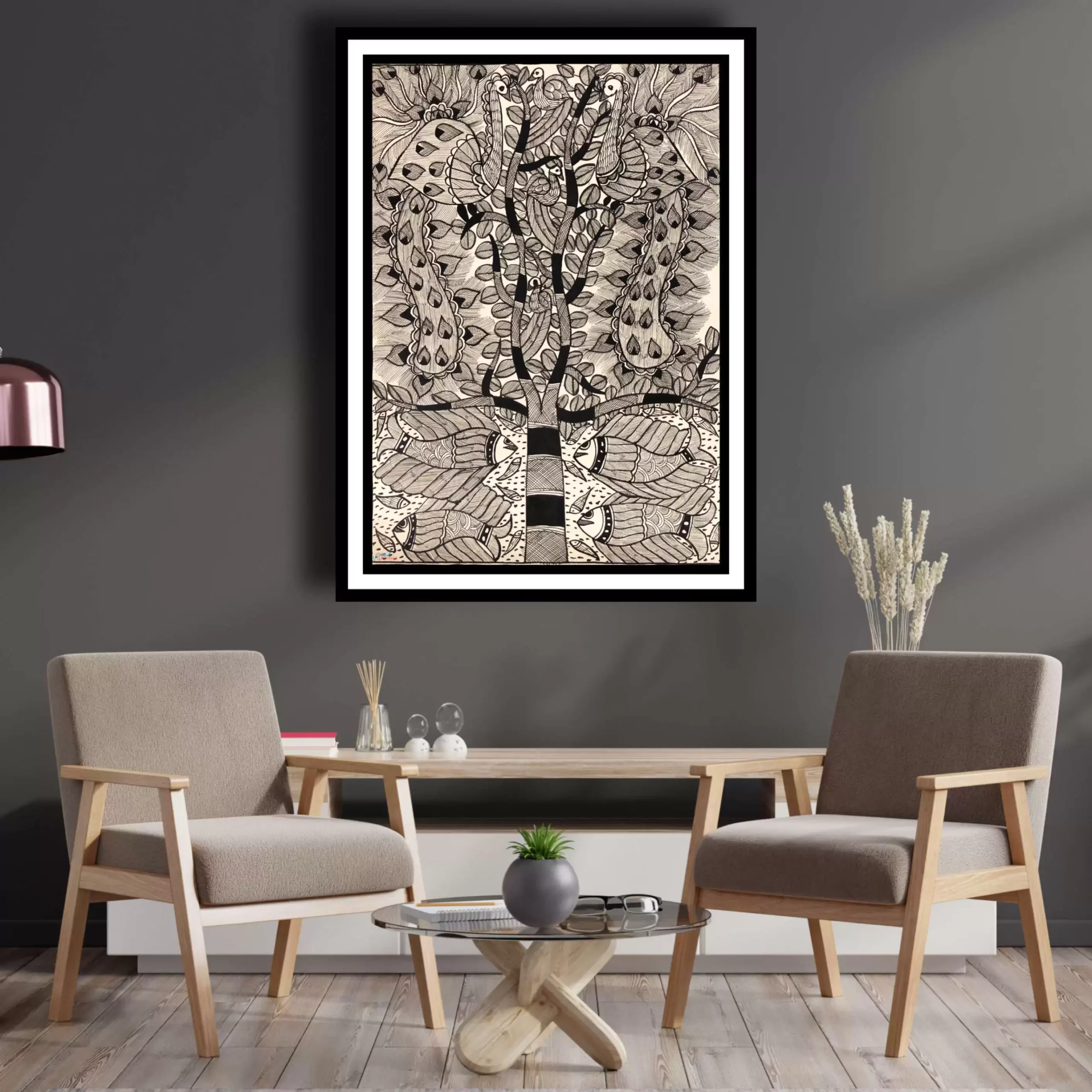 Madhubani Art Painting of Fishes in Water and Dancing Peacocks on Tree for Home & Office Wall Art Decor | Art Darshan